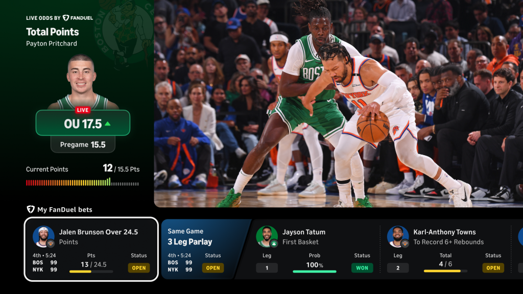 Opt-in, personalized BET tracking experience with Faunduel provides real-time integration of betting information during live game action. When a fan links their prime video profile to their fannal account, their active NBA bats will be displayed on the screen along with relevant progress and update and won/lost status. The feature does not provide the ability to place the bat directly to the prime video.