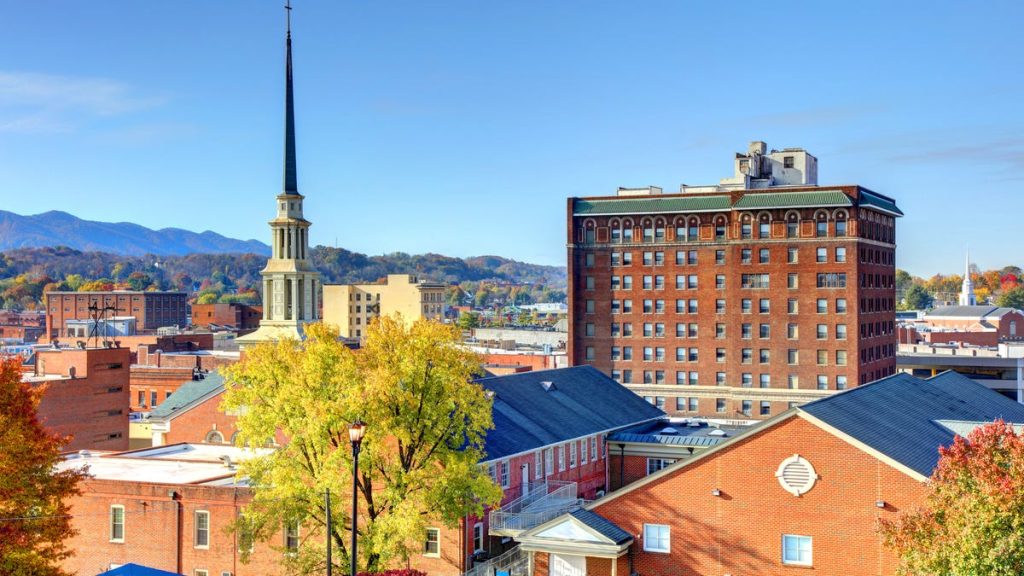 Tennessee Downtown Johnson City, including a long church steep and several red brick buildings.