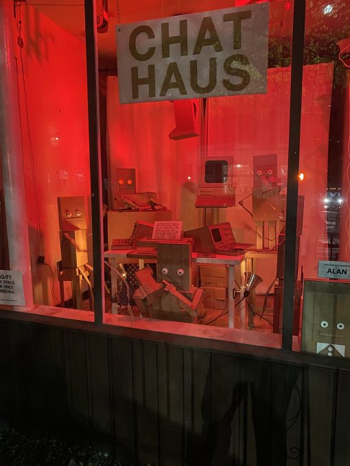 More precisely, the chat house is an art exhibition of Brooklyn artist Neem Ben-RaevenThe It has a few handful cardboard robots working on their computers through a small motor -controlled movement. Here is a sign that provides the desk space for $ 1,999 in the month “and the other is the place that the place is” a luxurious co-operative space for chattabots. “